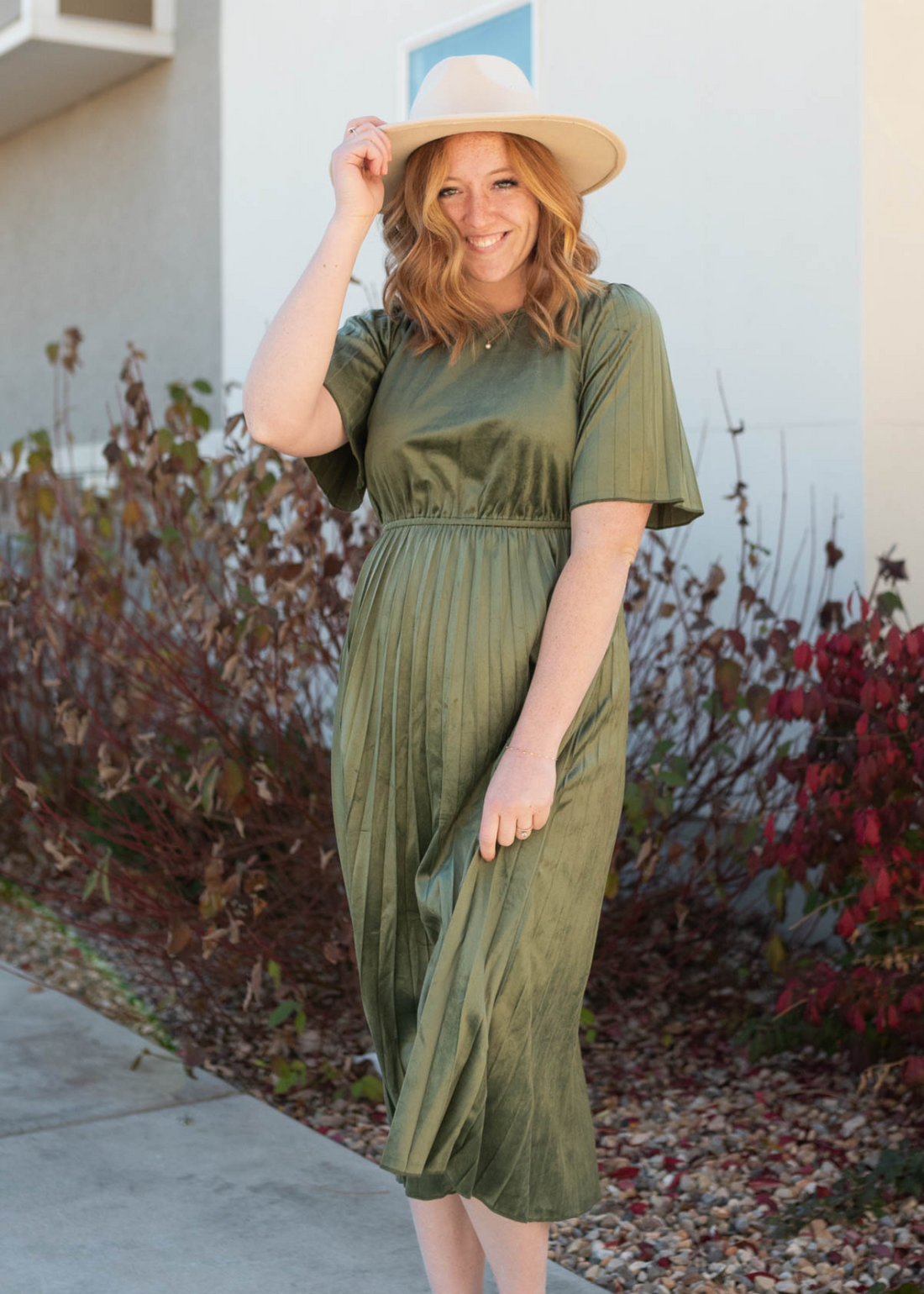 Kahlani Olive Pleated Velvet Dress