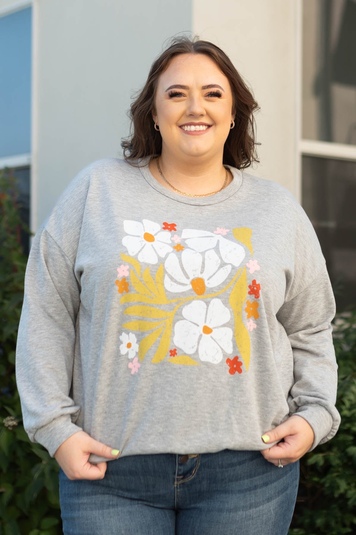 - Heather grey background + multi color floral graphic