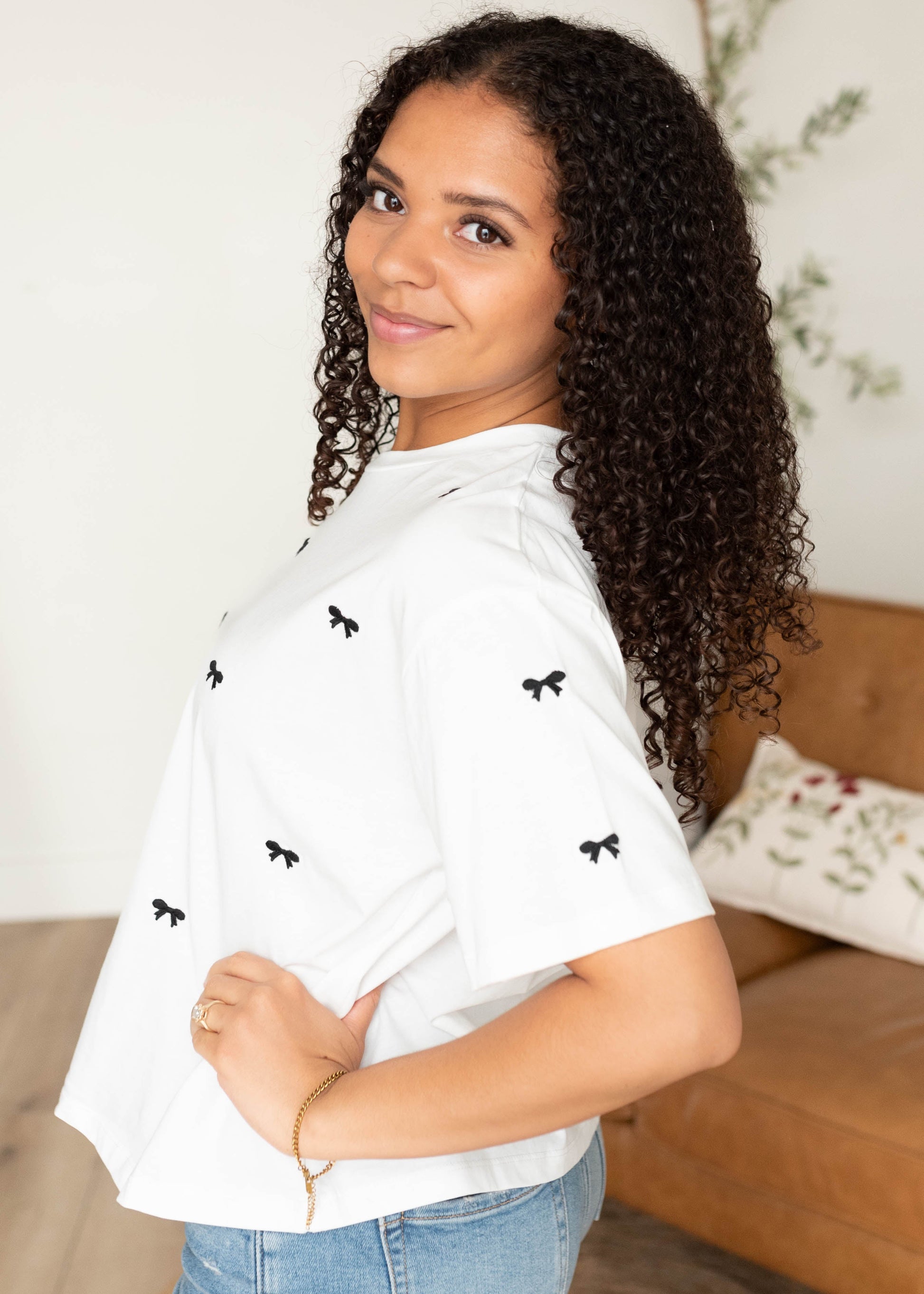 - White with black embroidered bows