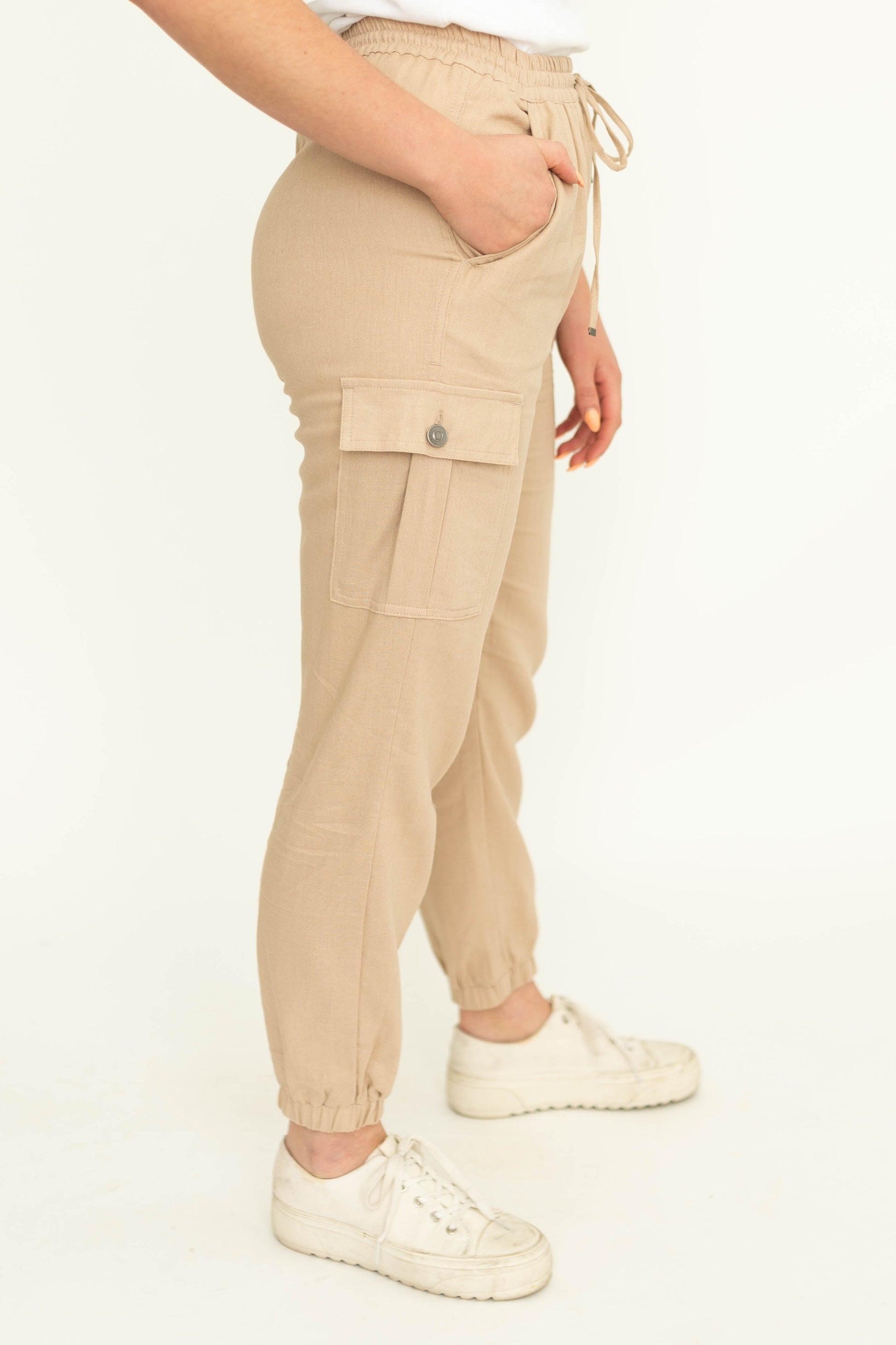 - Neutral khaki + cargo style joggers