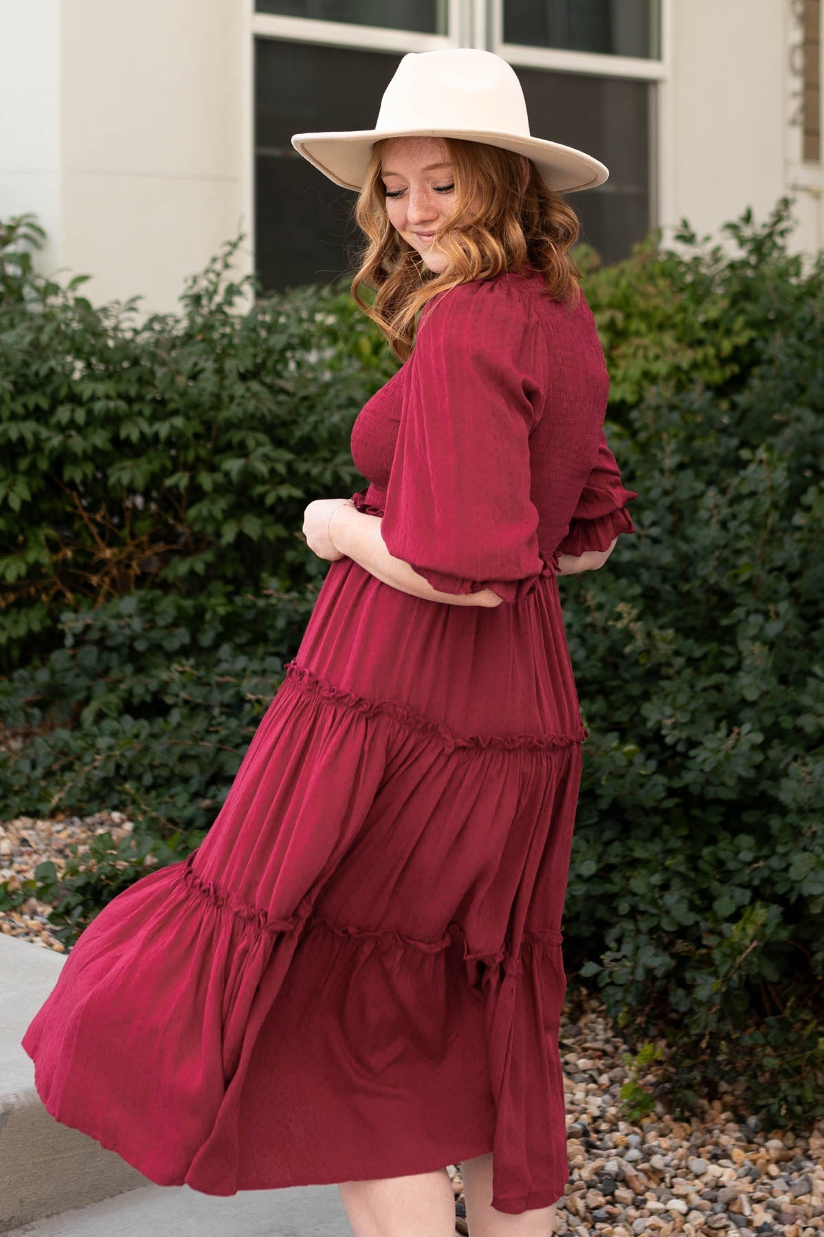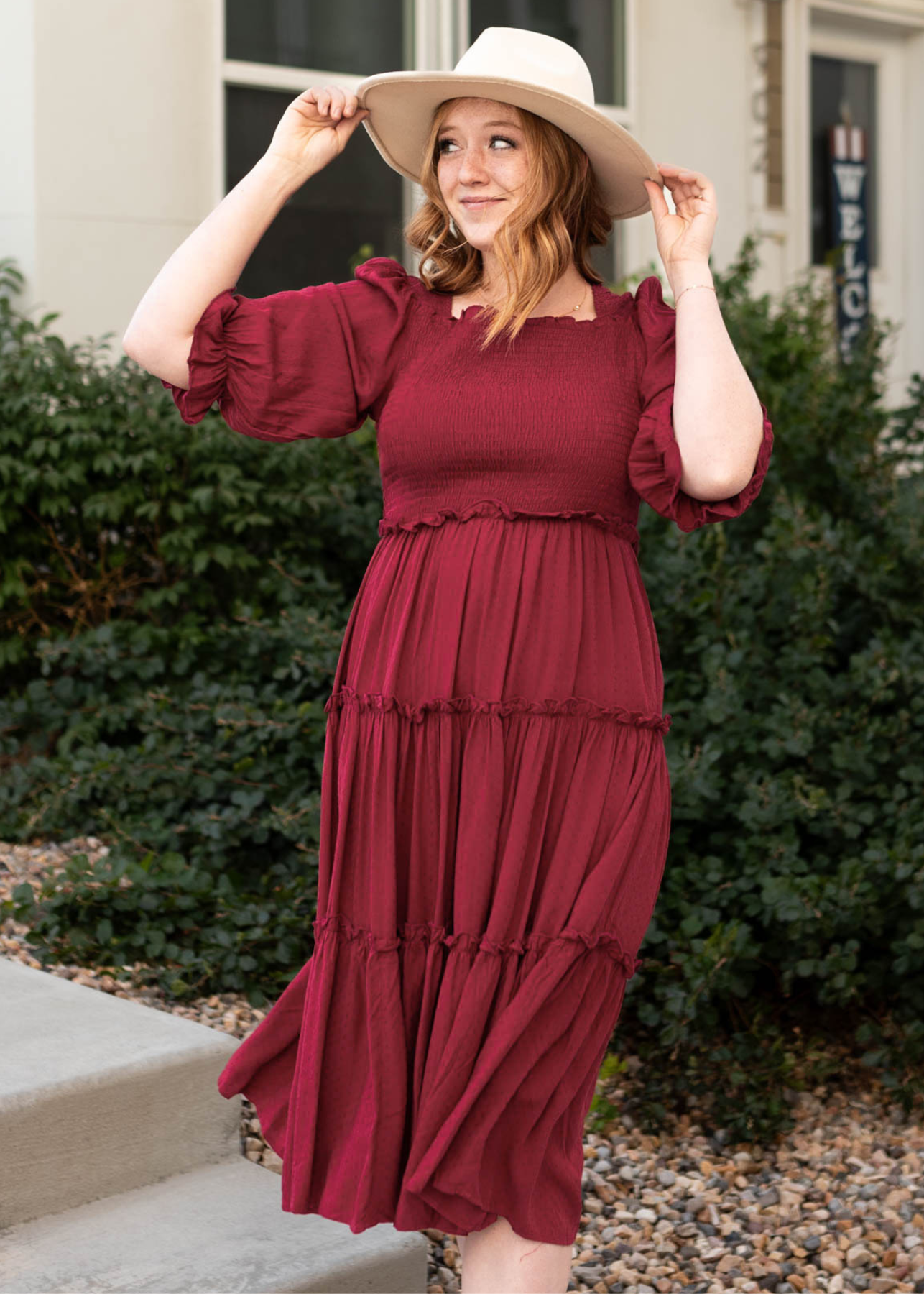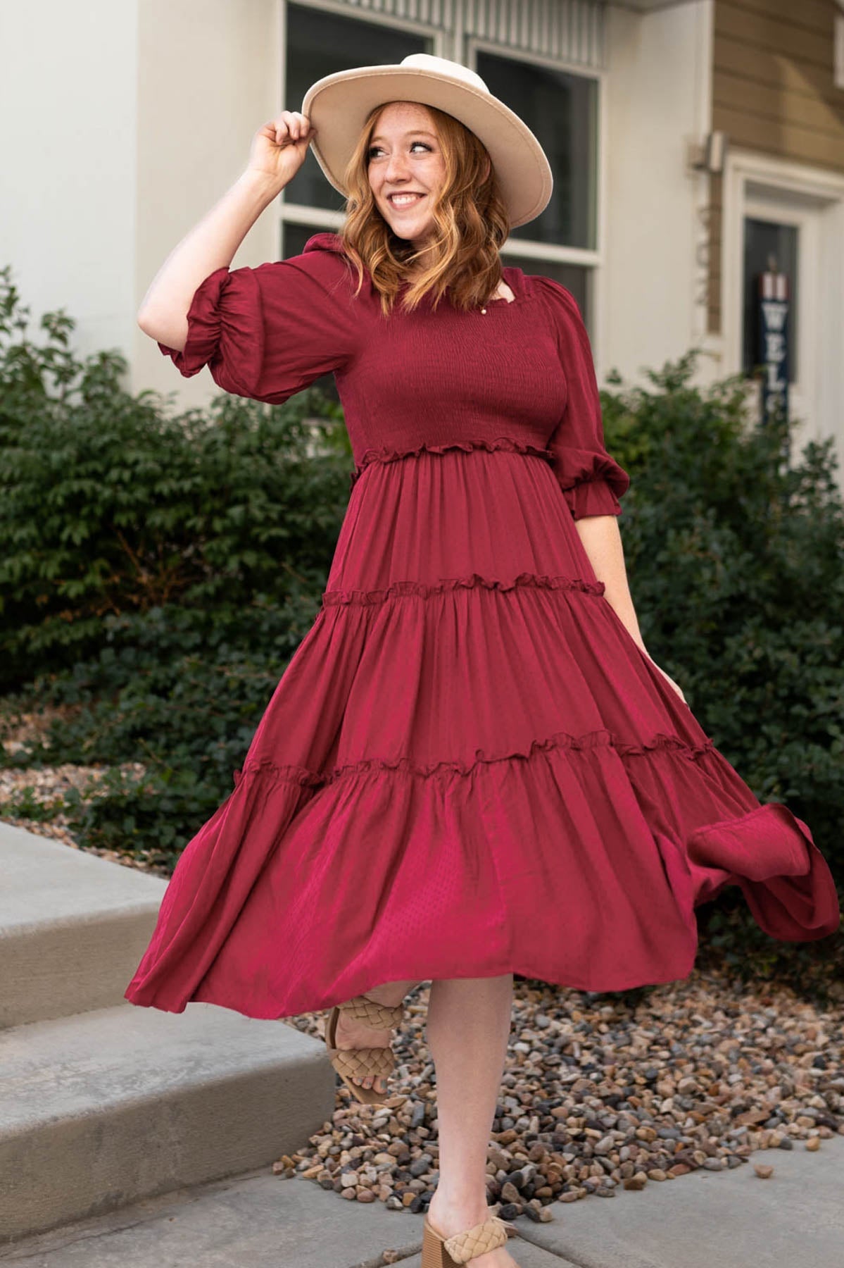- Flattering square neckline + flowy tiered skirt