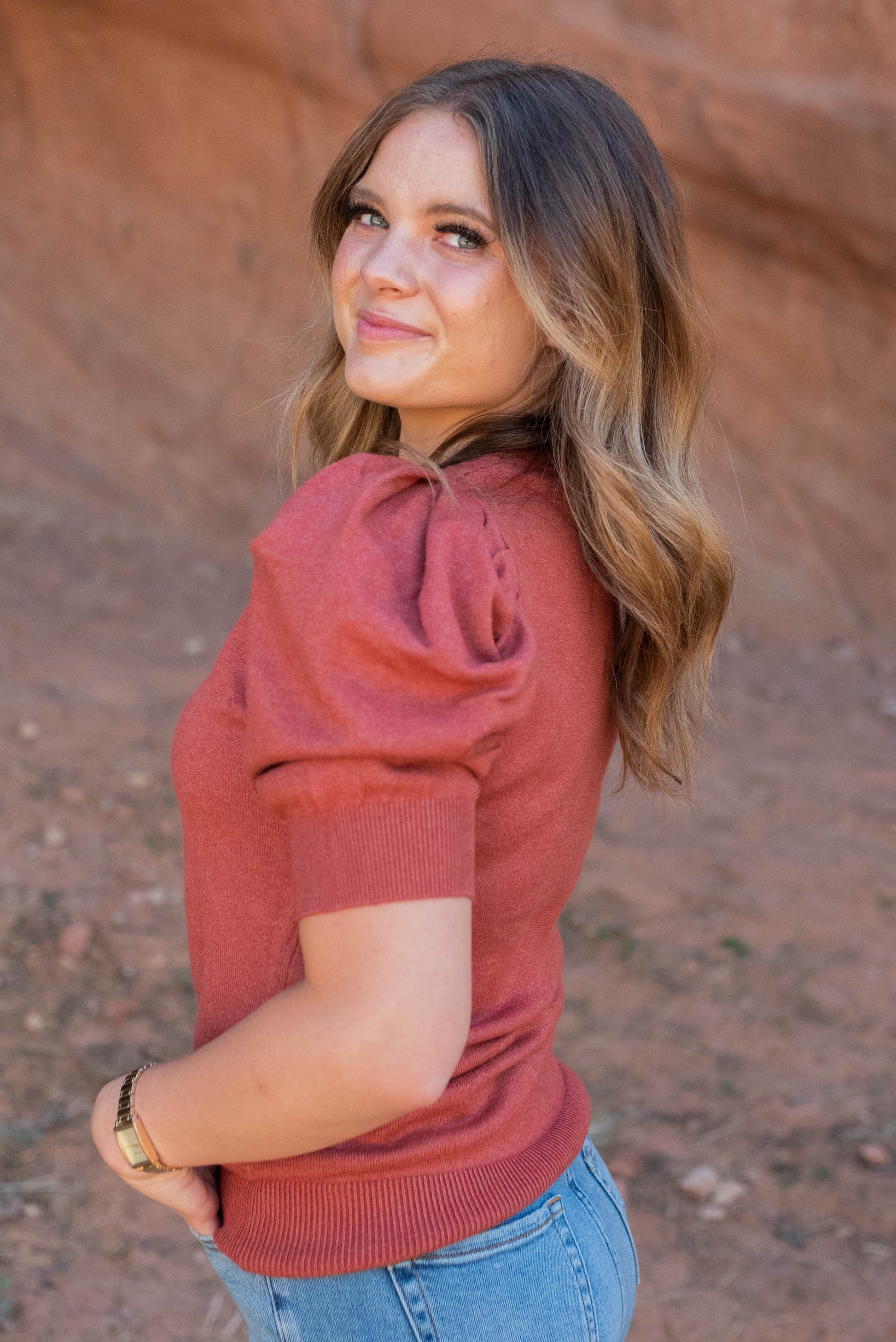 Jennifer Heather Rust Puff Sleeve Sweater Top
