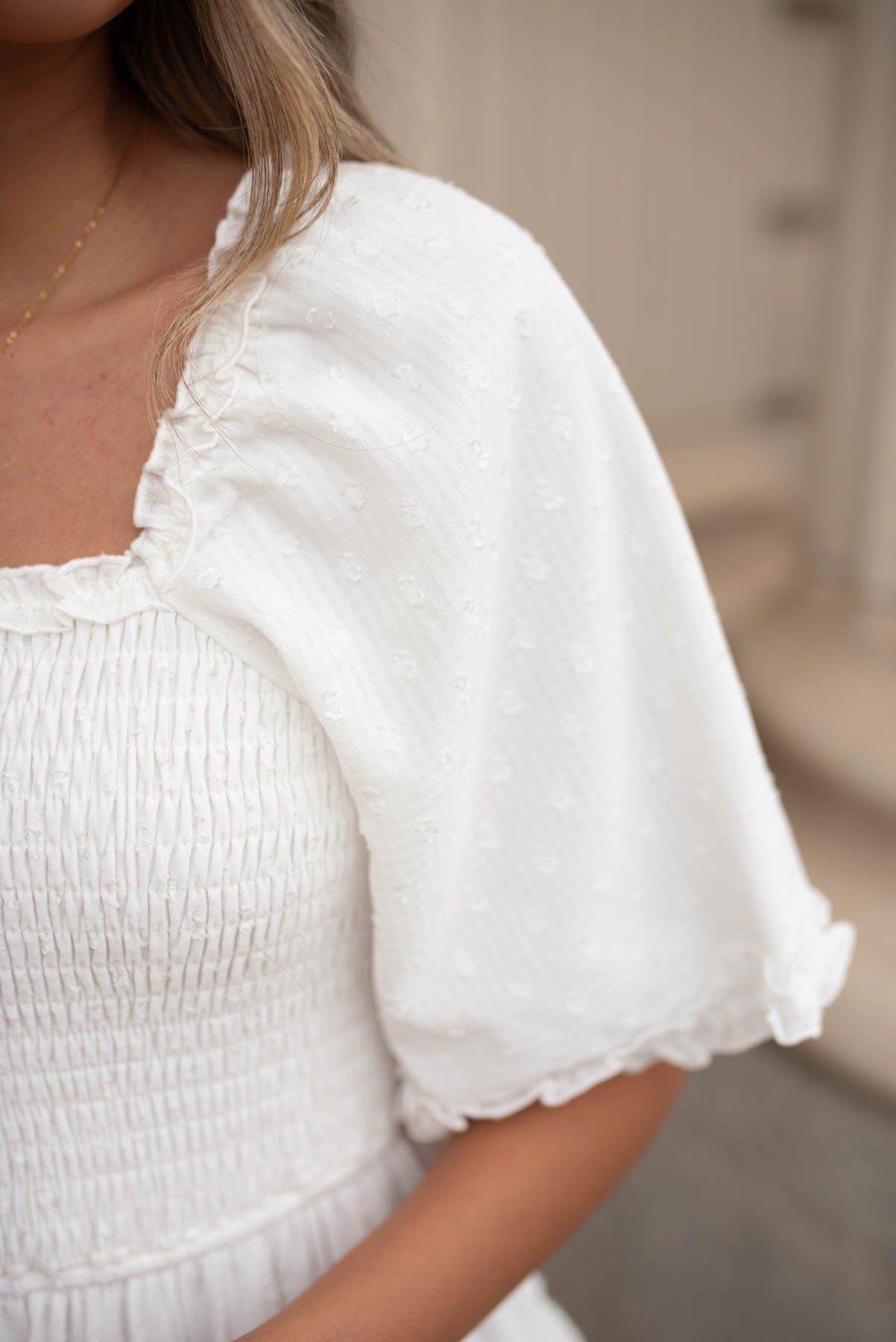- Beautiful overlay fabric with subtle gingham pattern and raised swiss dot details
