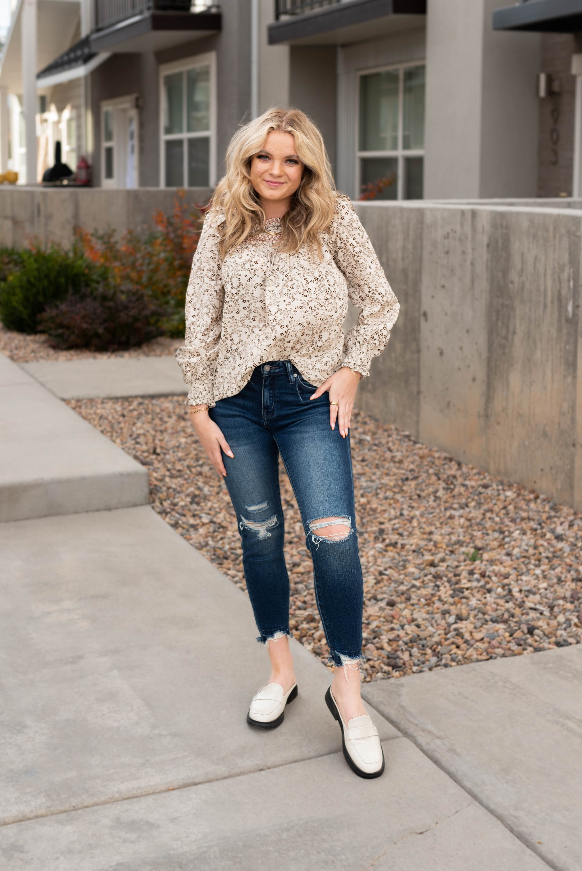 - Ivory base + taupe floral print