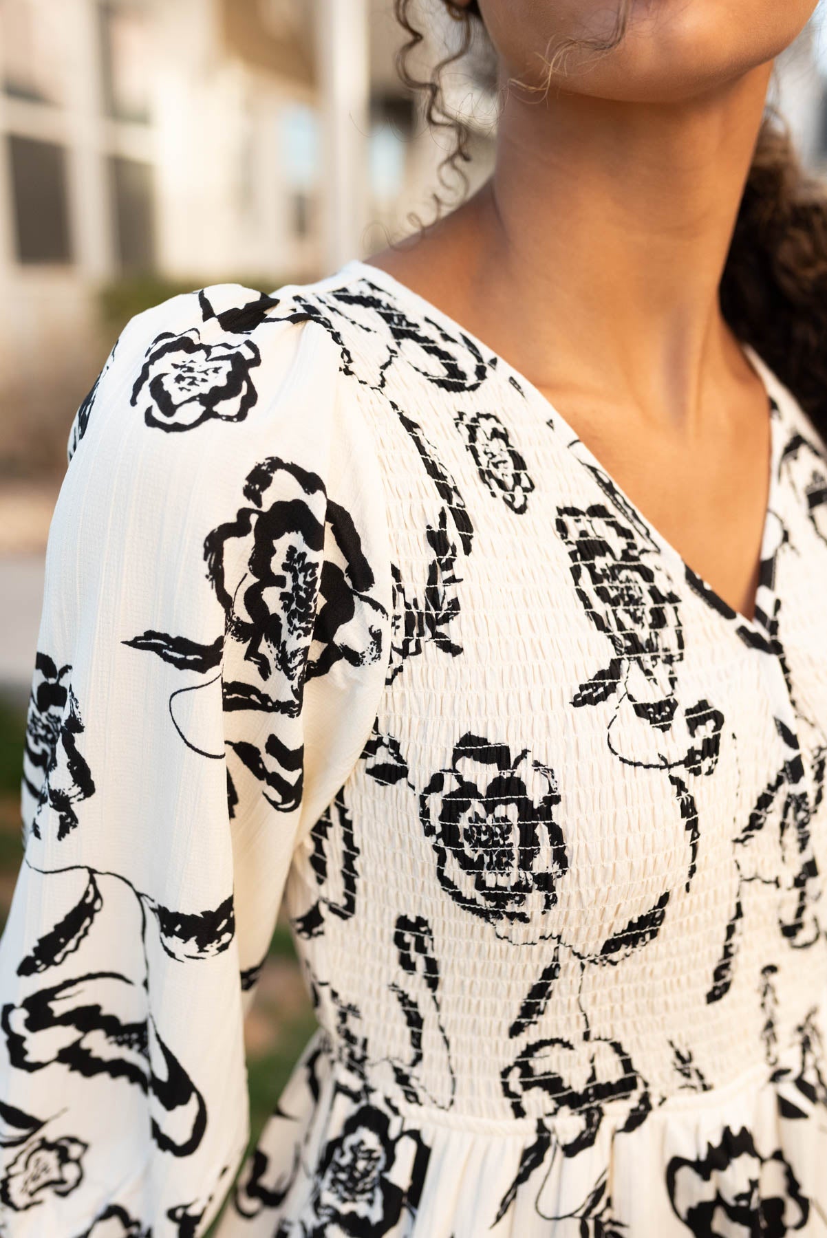 - White dress with large black floral print